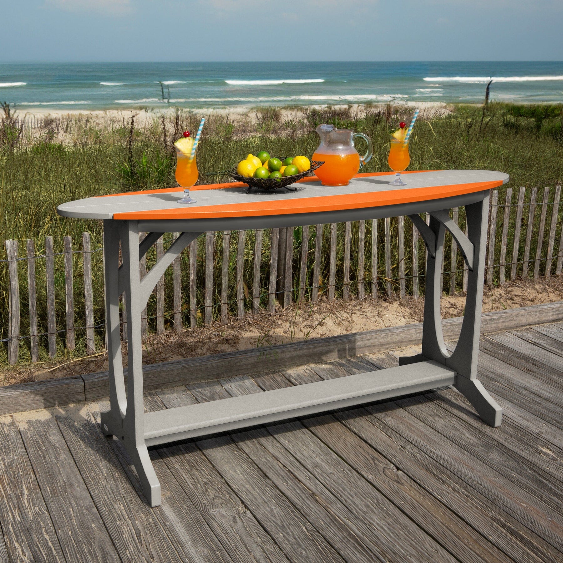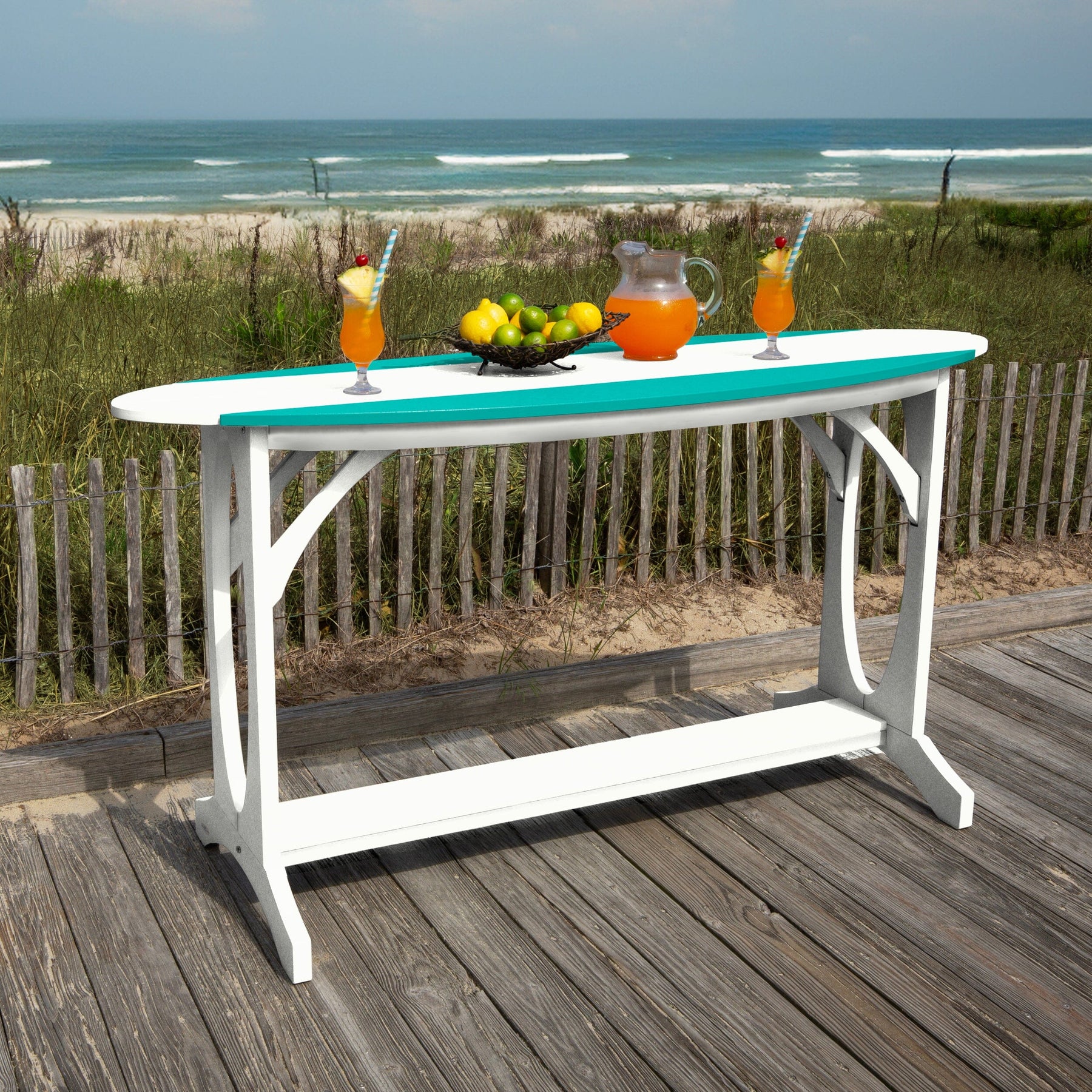 This table pairs well with both our backless and backed Shoreline Bar Stools, or mix and match it with your own style of existing stools. As a bar-height product, it is perfect for entertaining guests or even as an outdoor side table due to its narrower top design. The two-tone color combinations are perfect for evoking that summertime feeling year-round.