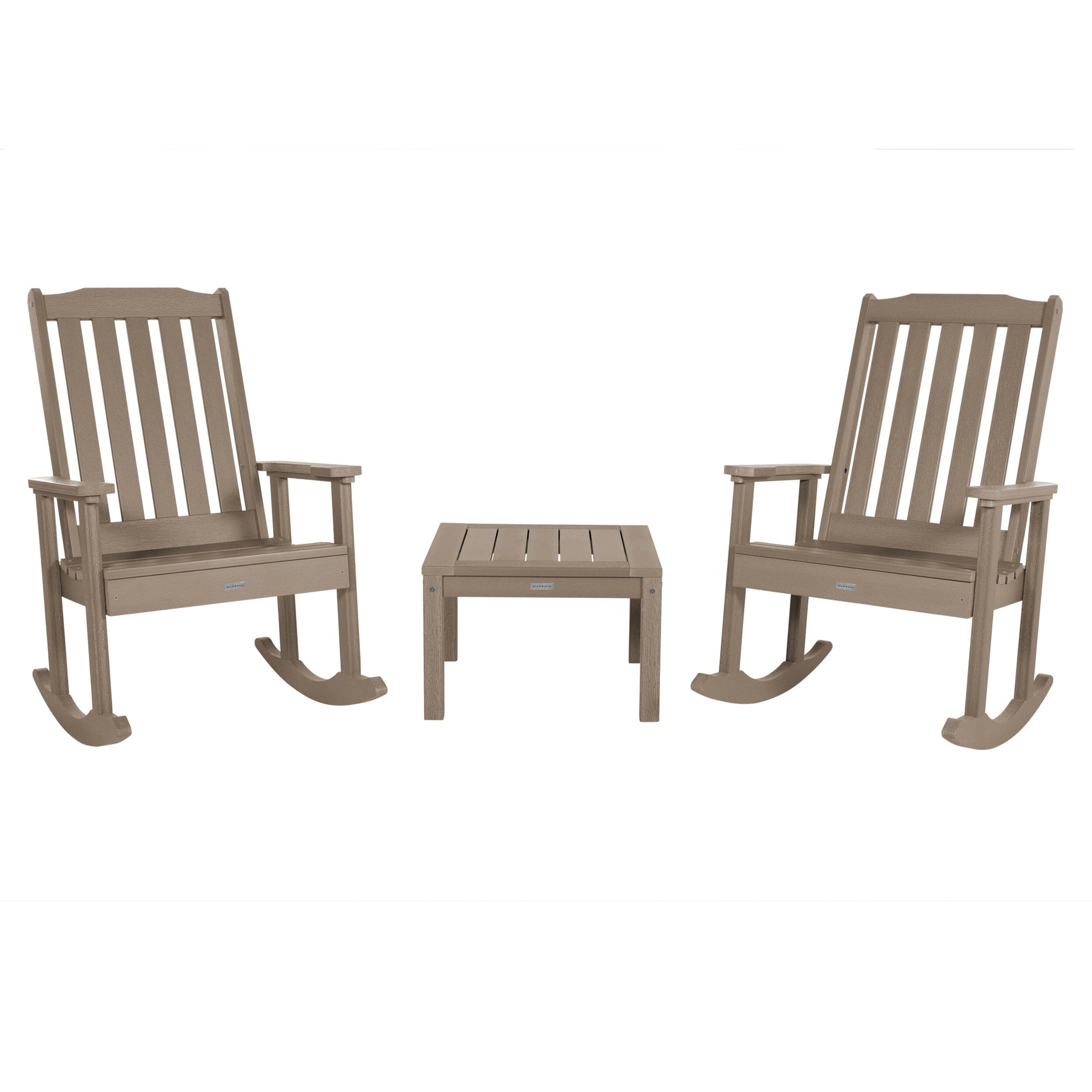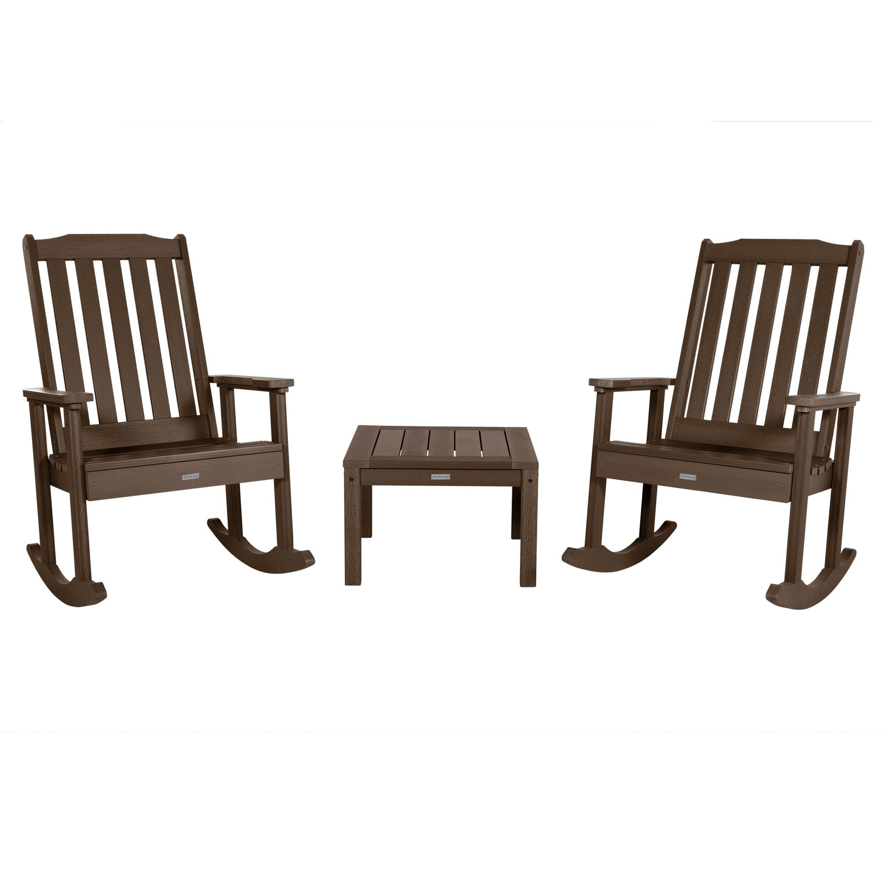 2 Lehigh Rocking Chairs with Adirondack Side Table Kitted Sets Highwood USA Weathered Acorn